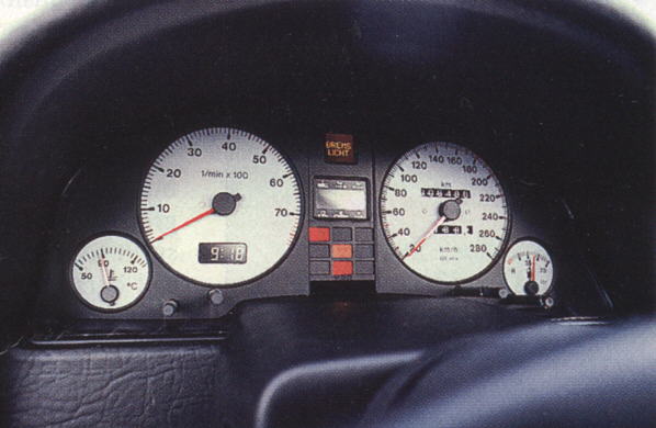 Here's a shot of an S2's interior and a closeup of the white gauges. I NEED one of those steering wheels!! Update: I finally got one!! :^) |